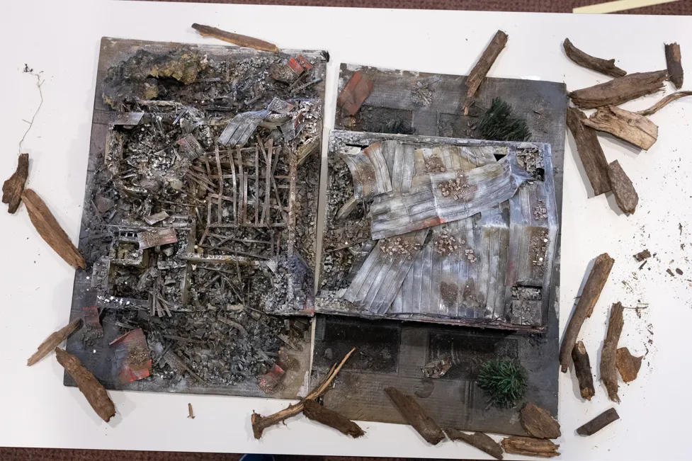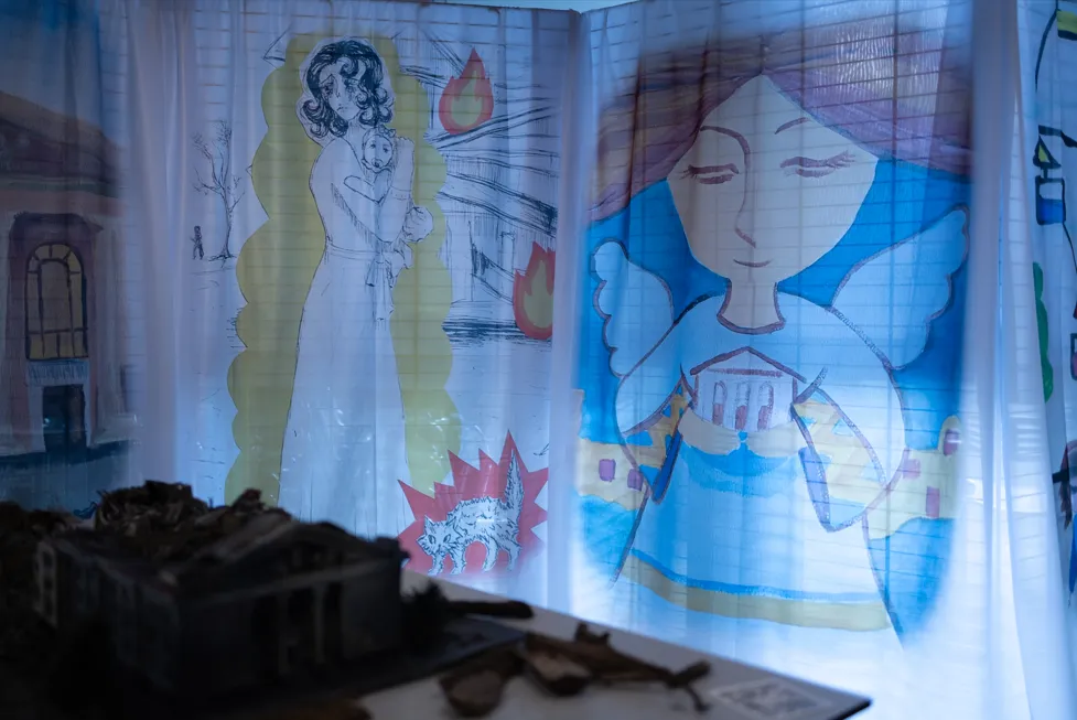 Дитячі малюнки на вітрилах, створені після пережитої окупації. Образ Драмтеатру, знищеного разом із людьми всередині. Відеоінсталяція, що демонструє, яким було місто і що з ним сталося.